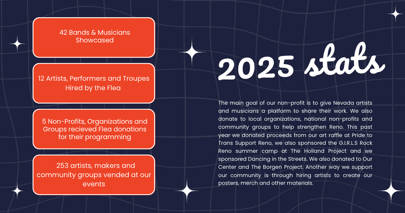 Although we are a non-profit ourselves and all of our events are volunteer-run, we also donate a percentage of our Flea revenue to sponsor other non-profit events in our community. Thank you for supporting the Flea and showing everyone how rad Reno is!