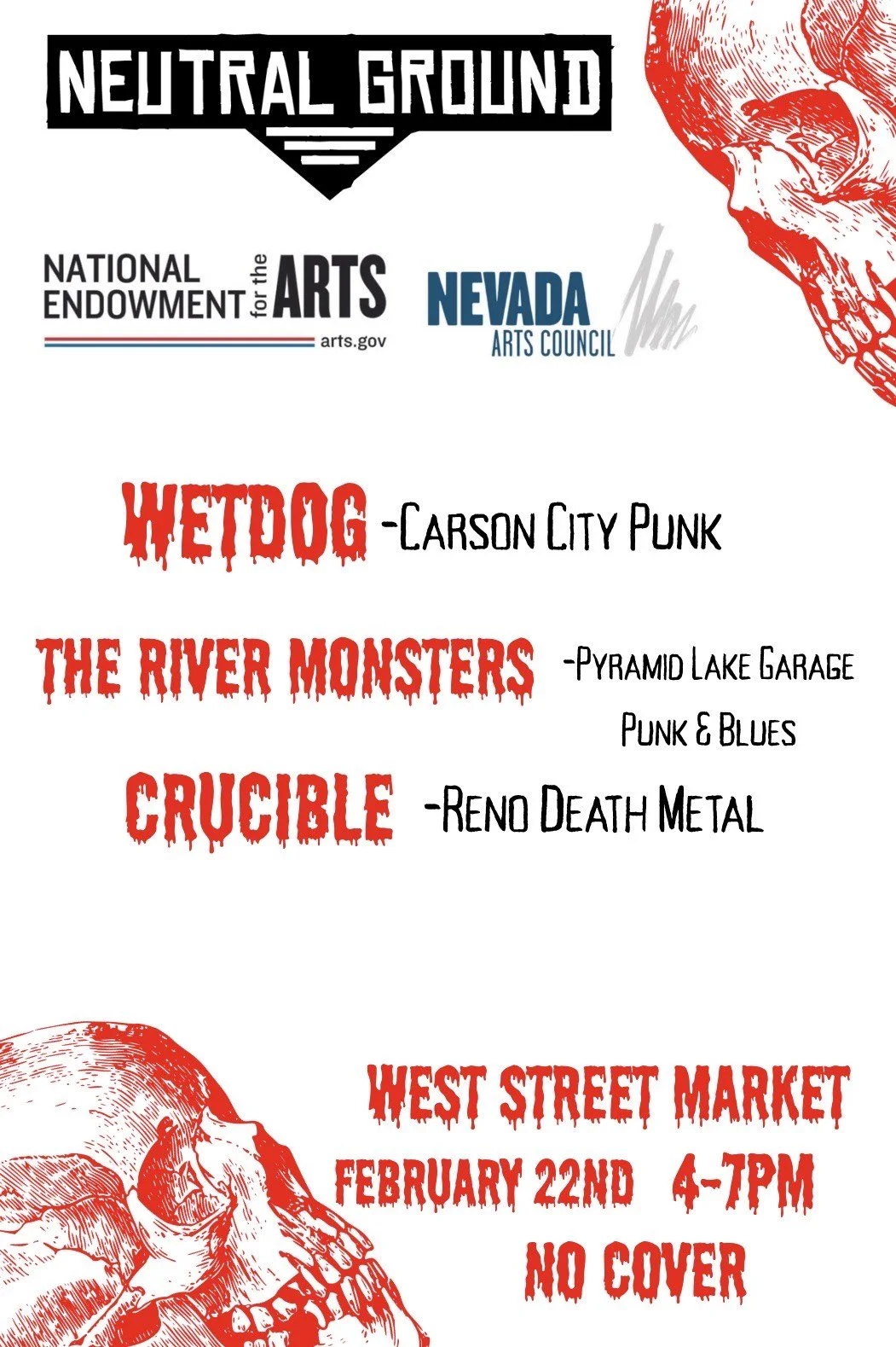 Every last Sunday of the month is our monthly matinee, Neutral Ground, at the Holland Project, 4th Street Coffee Bar or West Street Market depending on availability. All venues are all-ages spaces and all are invited. NG is a space for new bands to play their first gig, veteran bands to try out new material and traveling bands to get a taste of Reno! The Neutral Ground event has recently been awarded a Nevada Arts Council Grant for 2026! Neutral Ground will now be totally FREE until May 2026! Thank you so much Nevada Arts Council.